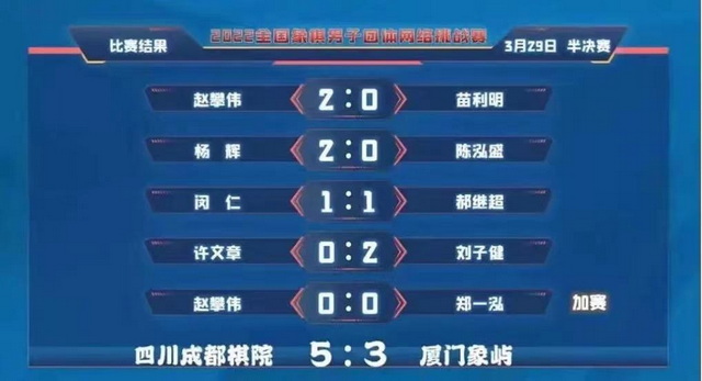 今年廈門象嶼象棋隊(duì)看點(diǎn)豐富,鄭一泓特大繼續(xù)領(lǐng)銜,團(tuán)隊(duì)幾位大將都是棋壇屈指可數(shù)的風(fēng)云人物,還大手筆引進(jìn)“東北虎”趙國(guó)榮特大和“98黃金一代”劉子健大師。陣容調(diào)整后的廈門象嶼象棋隊(duì),此次在過(guò)關(guān)斬將中充分磨合團(tuán)隊(duì)、調(diào)整戰(zhàn)術(shù),3月27日以6:2戰(zhàn)勝奪得過(guò)全運(yùn)會(huì)、智運(yùn)會(huì)團(tuán)體冠軍的浙江隊(duì),晉級(jí)四強(qiáng);昨日半決賽,又與象甲聯(lián)賽三屆衛(wèi)冕冠軍四川隊(duì)幾番廝殺,互有勝負(fù),最終以3:5惜敗。至此,廈門象嶼象棋隊(duì)取得本次團(tuán)體網(wǎng)絡(luò)挑戰(zhàn)賽并列第三名的佳績(jī)。中國(guó)象棋協(xié)會(huì)在戰(zhàn)報(bào)中評(píng)價(jià)道,“鄭一泓特大領(lǐng)銜的廈門象嶼隊(duì)今年或許會(huì)成為一支不可忽視的力量,讓我們拭目以待。”